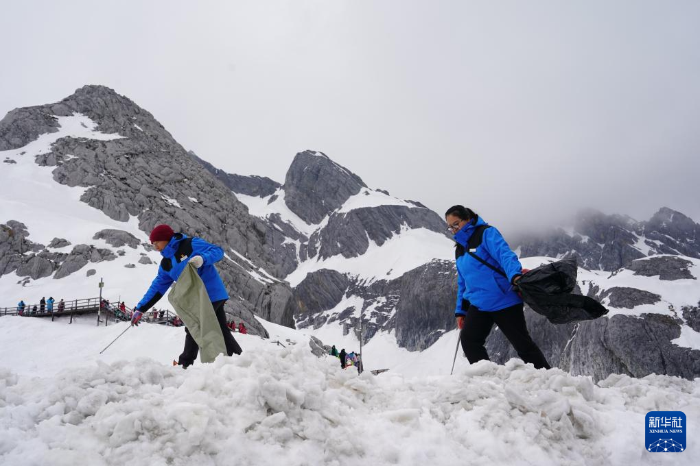 丽江玉龙旅游股份有限公司索道经营分公司景区部环卫三组组员和德军与同事和兴兰在雪地上清理垃圾(3月26日摄)。新华社记者 陈欣波 摄