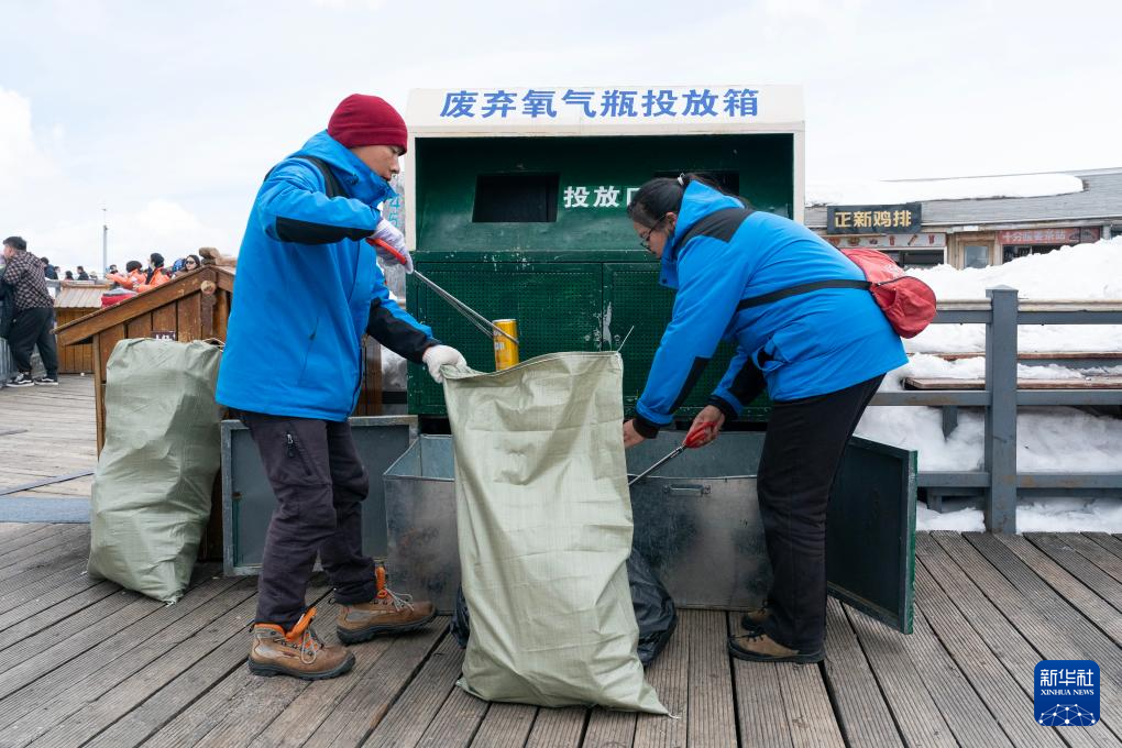 丽江玉龙旅游股份有限公司索道经营分公司景区部环卫三组组员和德军(左)与同事和兴兰在清理废弃氧气瓶(3月26日摄)。新华社记者 陈欣波 摄