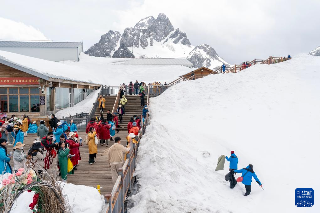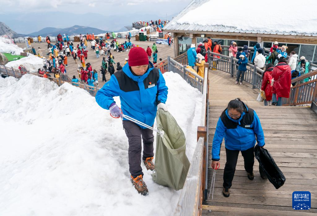丽江玉龙旅游股份有限公司索道经营分公司景区部环卫三组组员和德军(左)与同事和兴兰在清理游客栈道外雪地上的垃圾(3月26日摄)。