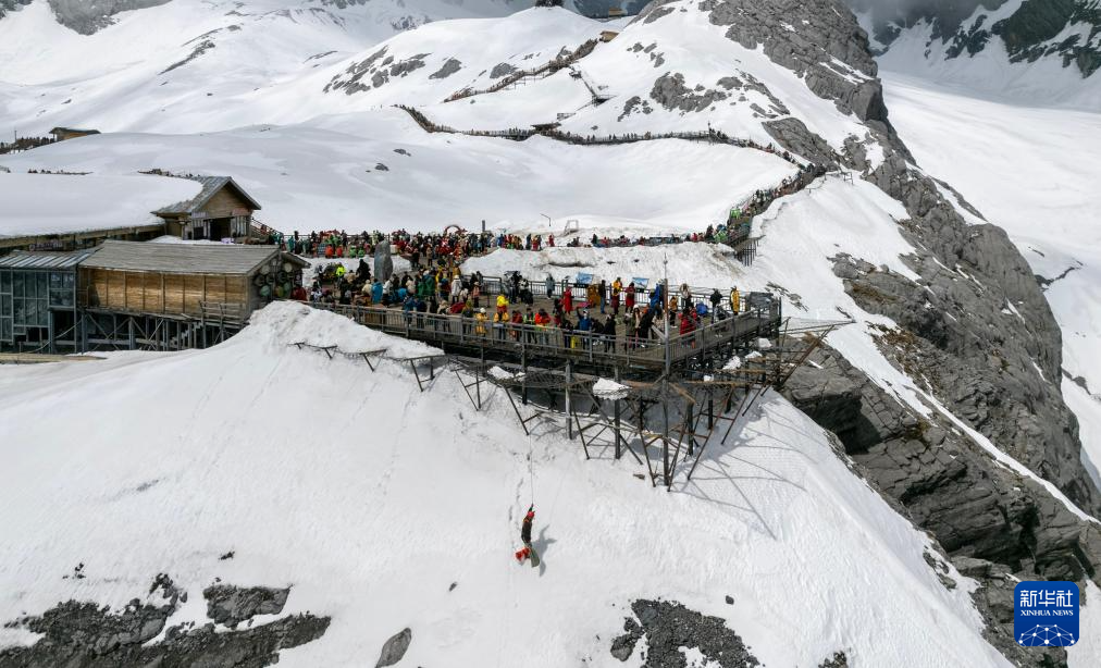 丽江玉龙旅游股份有限公司索道经营分公司景区部保安三组组员吕皓葳在玉龙雪山崖壁上清理垃圾(3月26日摄,无人机照片)。新华社记者 陈欣波 摄