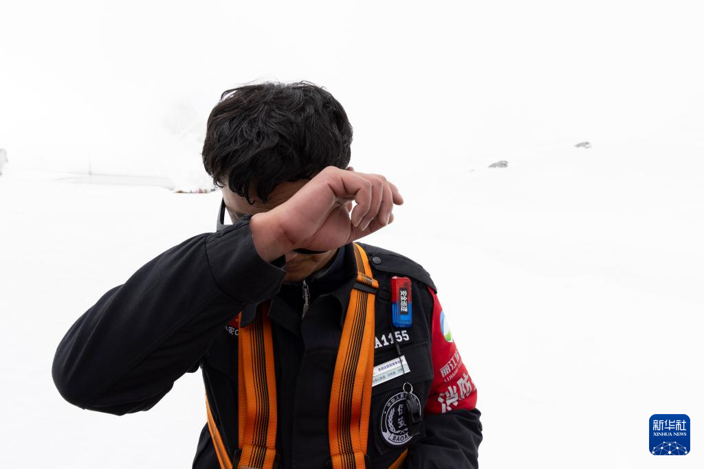丽江玉龙旅游股份有限公司索道经营分公司景区部保安三组组员吕皓葳在结束崖壁上的垃圾清理工作后在平台擦拭汗水(3月26日摄)。新华社记者 金立旺 摄