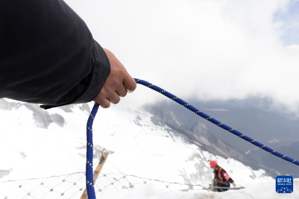 吕皓葳戴好墨镜、鞋套,系上C字扣、八字环,在身后挂上一只垃圾袋,翻越栏杆,往平台下的悬崖下降。同事在平台上一边缓缓释放安全绳,一边和他沟通,提示他哪里有垃圾……吕皓葳和同事们的工作是在玉龙雪山冰川公园清理掉落在悬崖峭壁的垃圾。他们通常两到三人一组,克服高海拔缺氧、地形陡峭、天气多变等不利因素,在队友的协助下攀爬到山崖间进行垃圾清理工作,被称为玉龙雪山景区的“蜘蛛人”。