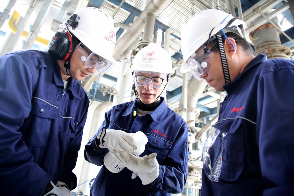 在盛虹石化产业园内,工程师正在查看光伏膜材料生产情况。新华社记者刘巍巍 摄