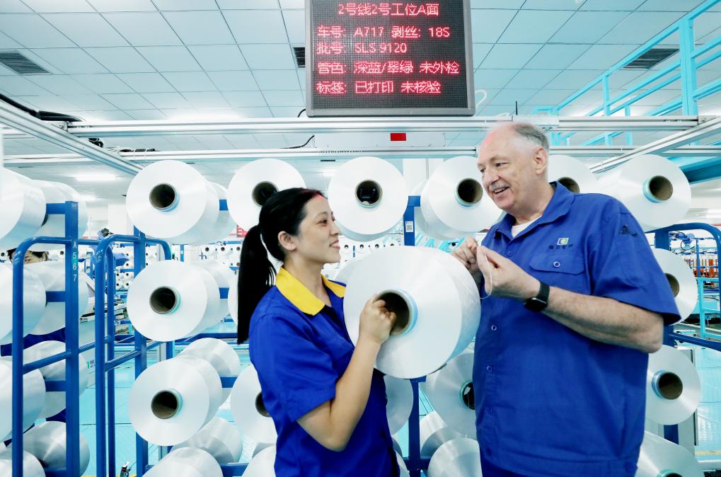 在恒力集团位于江苏的高性能聚酯纤维生产基地,外籍技术人员正在进行生产指导。新华社记者刘巍巍 摄