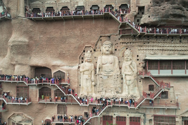 4月5日,游客在位于天水市麦积区的麦积山石窟游览(无人机照片)。 新华社记者 张智敏 摄