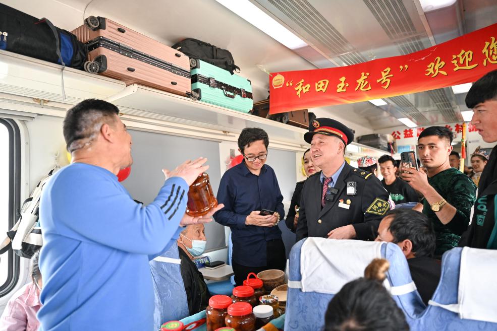 列车缓缓驶出莎车站,喀日所在的11号车厢很快满员。按照惯例,当天是列车上的“巴扎日”。为了帮助沿线居民增收致富,自2021年起,列车长会根据农时、客流等实际情况,在车厢里定期组织“流动巴扎”。当欢快的“麦西来甫”乐曲响起时,沿线上车的乡亲们纷纷拿出干果、果酱、木碗、木勺等家产物品,摆放到小车上,在列车员帮衬下吆喝叫卖,被吸引的旅客则围拢过来挑选和询价,车厢里顿时乐声、笑声一片。
