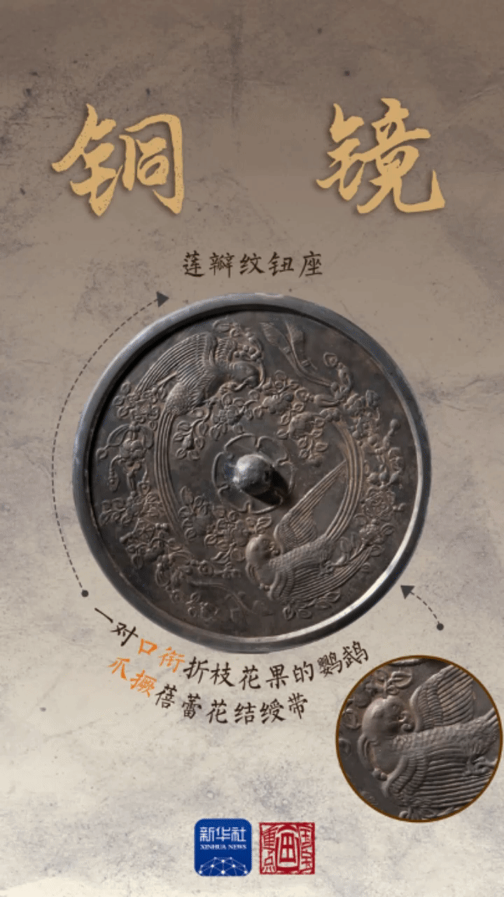 这枚设计精美的唐代鹦鹉衔枝绶带纹铜镜