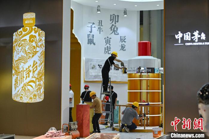 4月10日,第四届中国国际消费品博览会参展物品陆续上架。图为茅台展位的工作人员进行收尾施工。中新社记者 骆云飞 摄