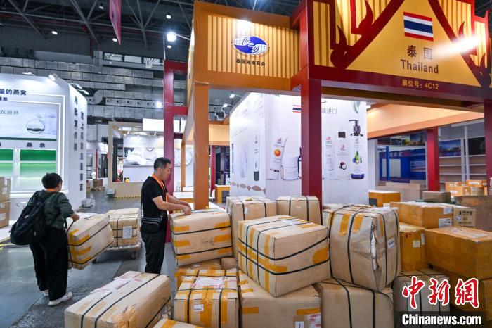 4月10日,第四届中国国际消费品博览会参展物品陆续上架。图为来自泰国的参展商整备参展商品。中新社记者 骆云飞 摄