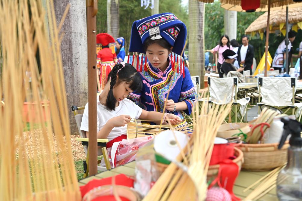 4月11日,一名孩子在广西南宁市青秀山主会场学习非遗技艺。新华社记者 周华 摄