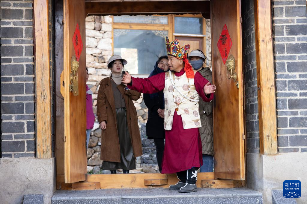 和杰林(前)在自家大门口为游客介绍院落布局(3月27日摄)。