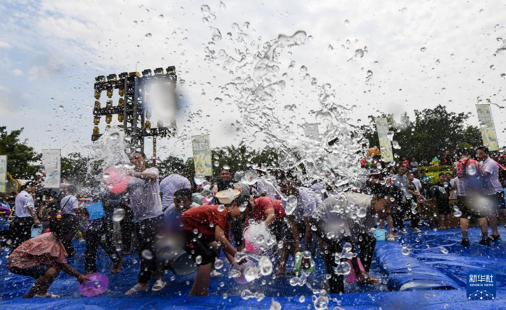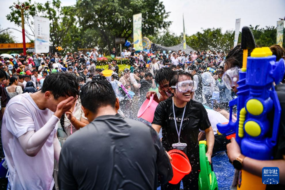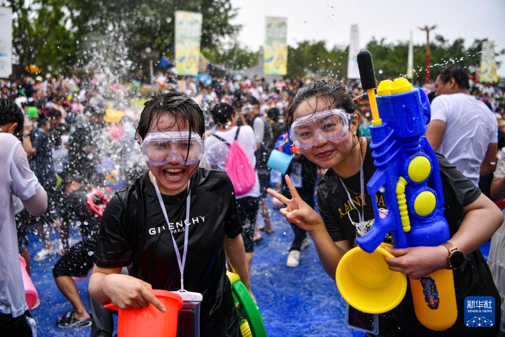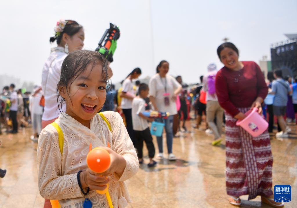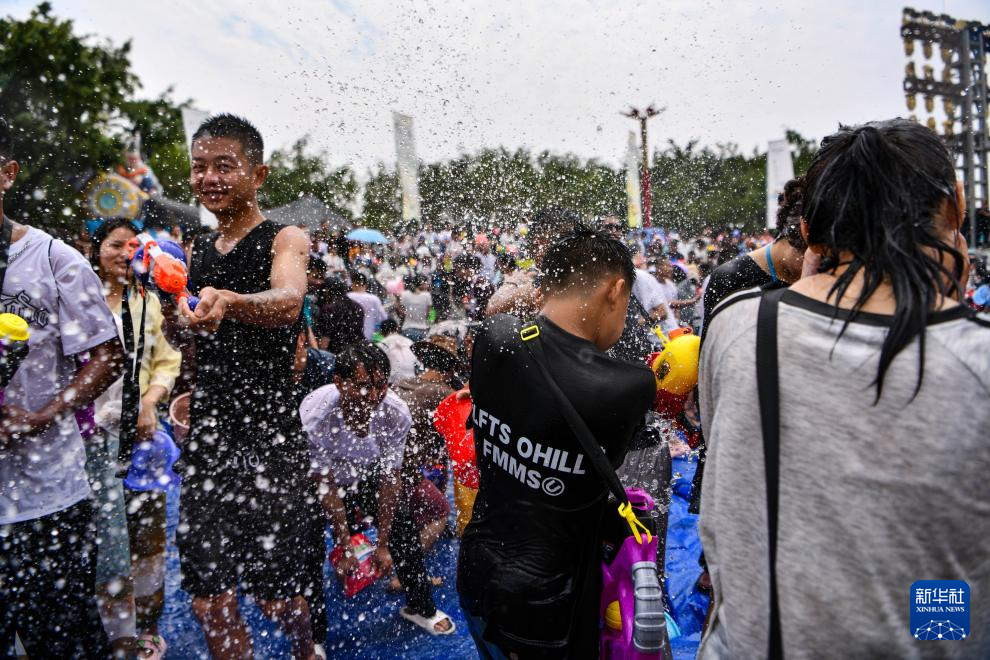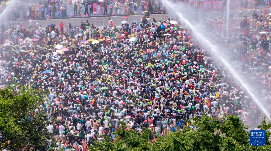 当日,云南省德宏傣族景颇族自治州2024年泼水狂欢节在芒市开幕,上万名当地各族群众与远道而来的游客欢聚芒市广场,互相泼水祝福。