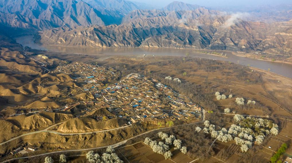 2021年4月5日拍摄的宁夏中卫市黄河黑山峡河段的南长滩村(无人机照片)。新华社记者 冯开华 摄