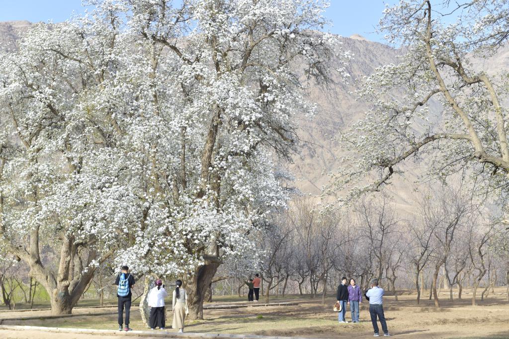 4月4日,游人在宁夏中卫市沙坡头区迎水桥镇南长滩村梨园观光拍照。新华社记者 毛竹 摄