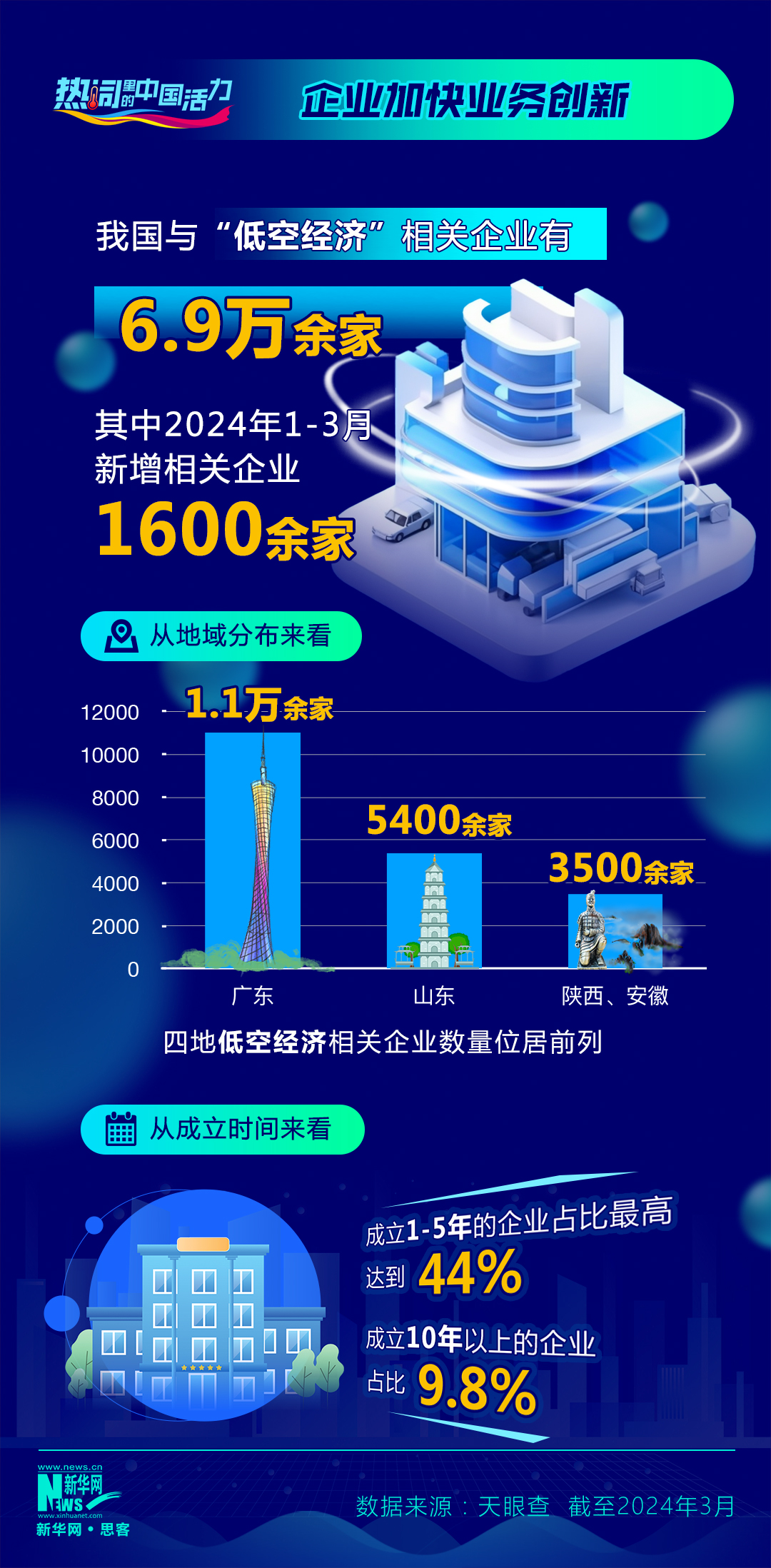 截止3月底,我国与“低空经济”相关企业有6.9万余家,其中2024年1-3月新增相关企业1600余家;从地域分布来看,广东、山东、陕西以及安徽(并列),四地低空经济相关企业数量位居前列,分别拥有1.1万余家、5400余家以及3500余家;从成立时间来看,成立1-5年的企业占比最高,达到44%,成立10年以上的企业占比9.8%。
