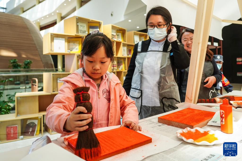 4月20日,山东省济南市第十四届“书香泉城”全民阅读节在济南市图书馆启动,小朋友在阅读节上体验传统印刷技艺。新华社记者 朱峥 摄