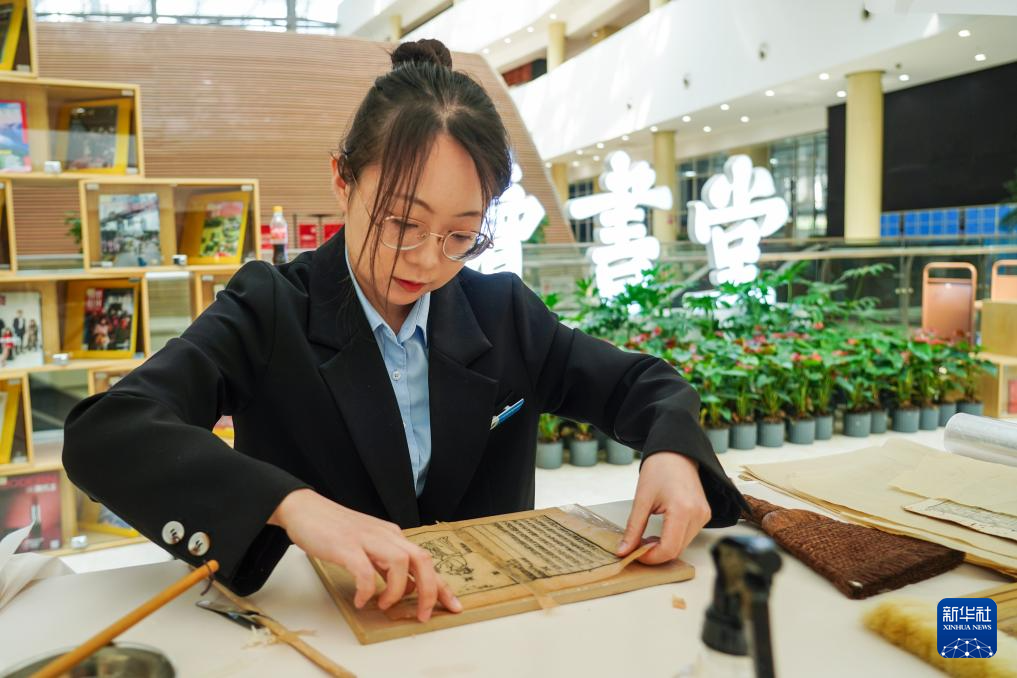 4月20日,山东省济南市第十四届“书香泉城”全民阅读节在济南市图书馆启动,济南市图书馆工作人员在阅读节上展示古籍修复技艺。新华社记者 朱峥 摄