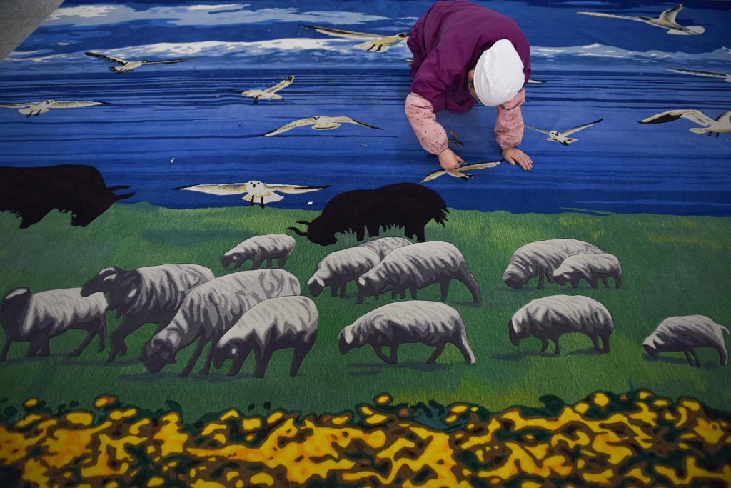 2023年2月21日,在西宁市圣源地毯集团生产车间,操作工检查毯面、拔花刺。新华社记者吴刚摄