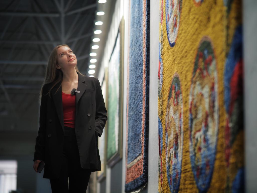 2024年3月20日,新华社外籍记者达莎在西宁市圣源地毯集团生产车间参观。新华社记者赵宇摄
