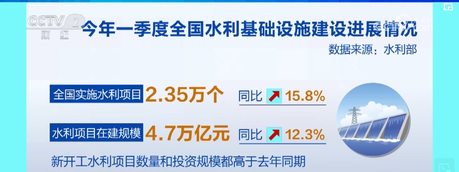 一季度,全国实施水利项目2.35万个、在建规模4.7万亿元,分别比2023年同期增长15.8%、12.3%,其中,新开工水利项目数量和投资规模都高于2023年同期,特别是总投资1亿元以上的水利项目新开工687个,比2023年同期增长94.6%。