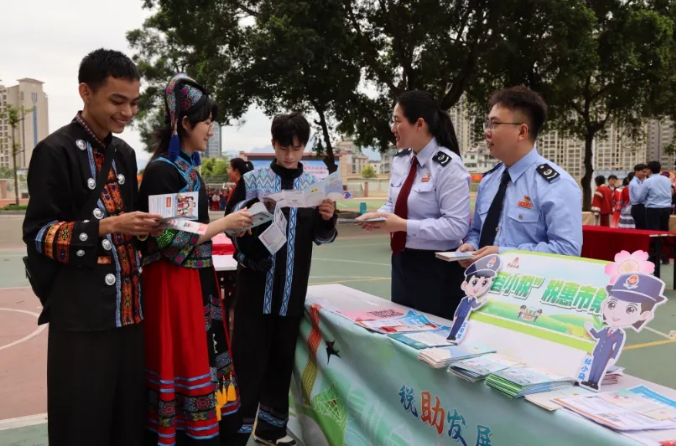 借助“三月三”传统节日,广西税务局的税务干部走进具有民族特色的学校,寓教于乐,开展普法活动,激励广大青少年学税法、用税法、护税法,将民族法治与税法融合,促进各中小学、高校的师生加深对税法知识的理解。