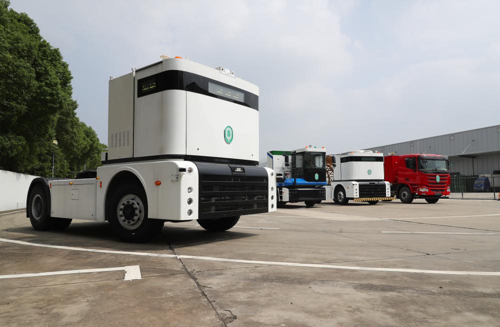 一辆西井科技的无人驾驶重卡Q-Truck(前)在位于上海的无人驾驶商用车联合实验室场地上进行动态测试(2023年9月26日摄)。 新华社记者 方喆 摄