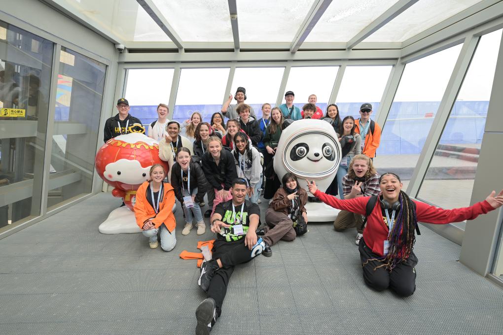 3月21日,美国华盛顿州中学生代表团的成员在首钢滑雪大跳台上与冰墩墩、雪容融合影。新华社记者 李鑫 摄
