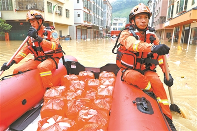 4月22日,广东江门消防救援支队队员划冲锋舟给英德市连江口镇居民送饭