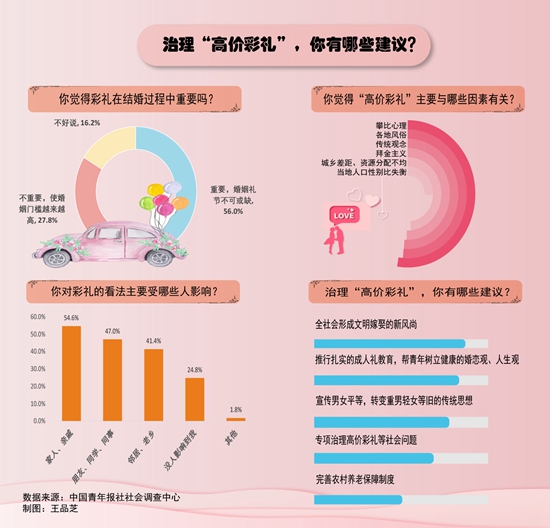 近年来,一些地方的彩礼数额不断走高,加重了年轻人婚恋负担。中国青年报社社会调查中心联合问卷网(wenjuan.com),对1001名受访者进行的一项调查显示,56.0%的受访者觉得彩礼在结婚过程中重要,是婚姻礼节不可或缺的。治理“高价彩礼”,60.5%的受访者希望全社会形成文明嫁娶的新风尚,59.3%的受访者建议推行扎实的成人礼教育,帮青年树立健康的婚恋观、人生观。