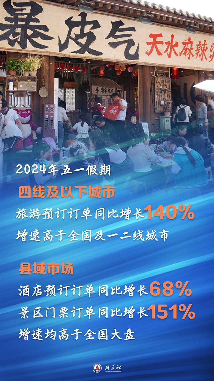 携程平台数据显示,“五一”假期,四线及以下城市旅游预订订单同比增长140%,跑赢全国大盘,且增幅明显高于一二线城市。县域市场酒店预订订单同比增长68%、景区门票订单同比增长151%,增速均高于全国大盘。天水、徐州、淄博、合肥、南昌、迪庆、景德镇、石家庄、烟台、黄山等城市成为目前“五一”假期酒店预订增速最快的城市。
