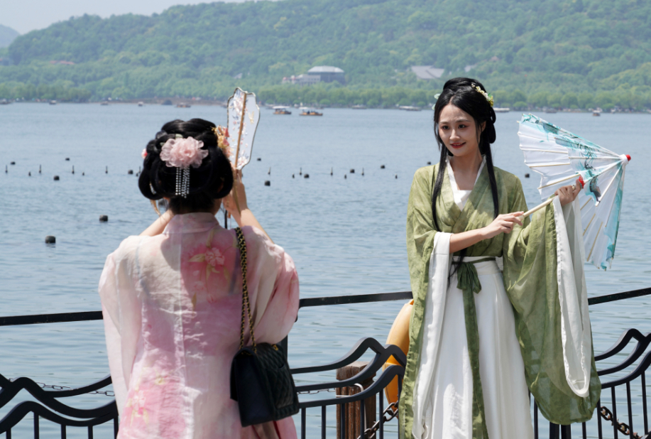 2024年4月18日,身着汉服的游客在杭州西湖边拍照。近日,杭州西湖景区旅游人气旺,前来观光游览的游客络绎不绝。新华社记者韩传号摄