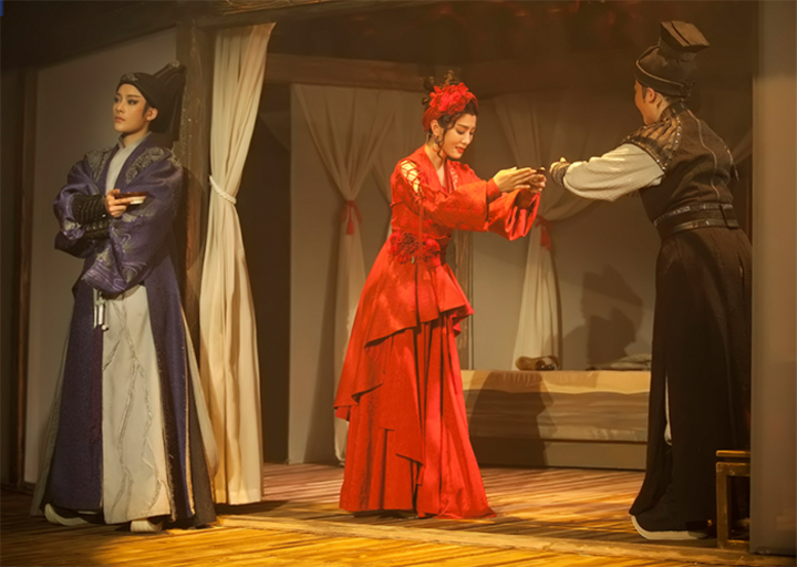 新国风环境式越剧《新龙门客栈》起初在短视频平台走红,热度从线上传导至线下,许多从未接触过越剧的观众走入剧场。环境式剧场不同于传统剧场的镜框式舞台,舞台不只是面前的一块区域,而是实现了观众“身在其中”,浓厚的“氛围感”扑面而来。