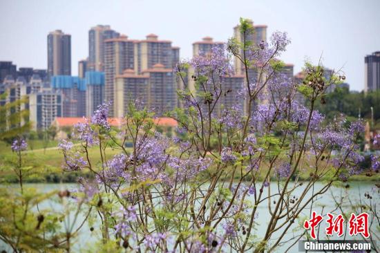 近日,广西南宁市蓝花楹盛开,蓝紫色彩为城市增添了一道浪漫美景。