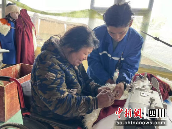 扎西夺尔登帮助残疾员工裁剪。阿坝州文明办供图