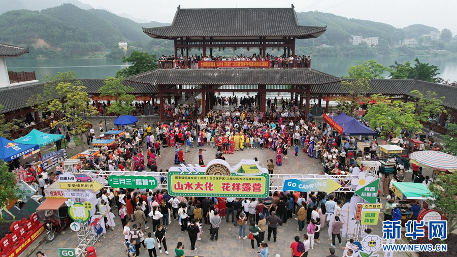无人机航拍“山水大化·花样露营”三月三露营节上人们载歌载舞。蓝吉富 摄