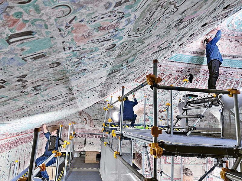 党的二十大报告提出,要加大文物和文化遗产保护力度。文物不可再生,“保护第一”是新时代文物工作的首要遵循。敦煌研究院探索多种创新手段,实现了从被动的抢救性保护到主动的预防性保护。图为2024年拍摄的莫高窟第55窟文物修复现场。敦煌研究院供图