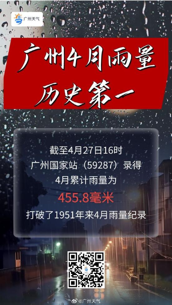 截至4月27日16时,广州国家站(59287)记录到的4月累计雨量为455.8毫米、打破了自1951年以来的4月雨量纪录。