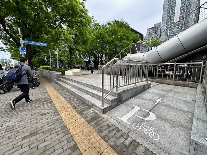 中关村地铁站B口外的自行车停放区修建了坡道,方便市民推车上下。新京报记者 裴剑飞 摄