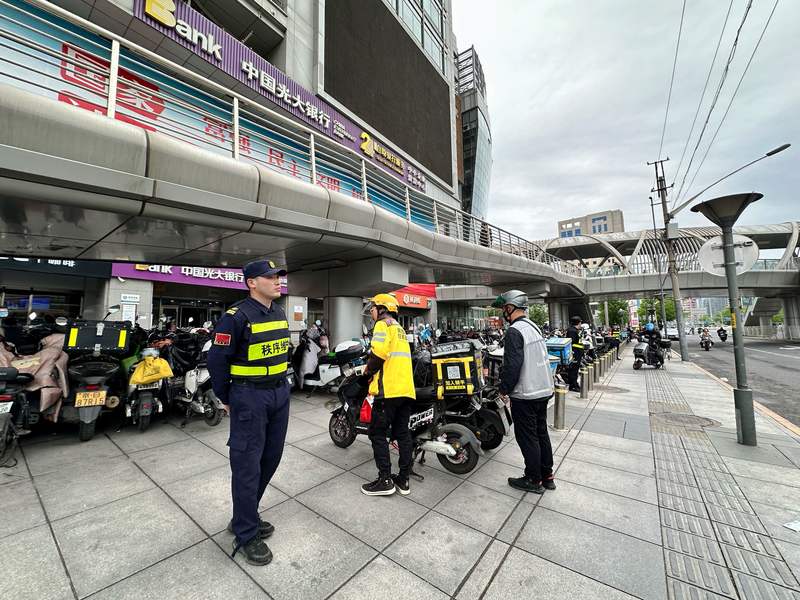 在中关村地铁站C1口外的过街天桥下,有保安值守引导外卖骑手有序停放车辆。新京报记者 裴剑飞 摄