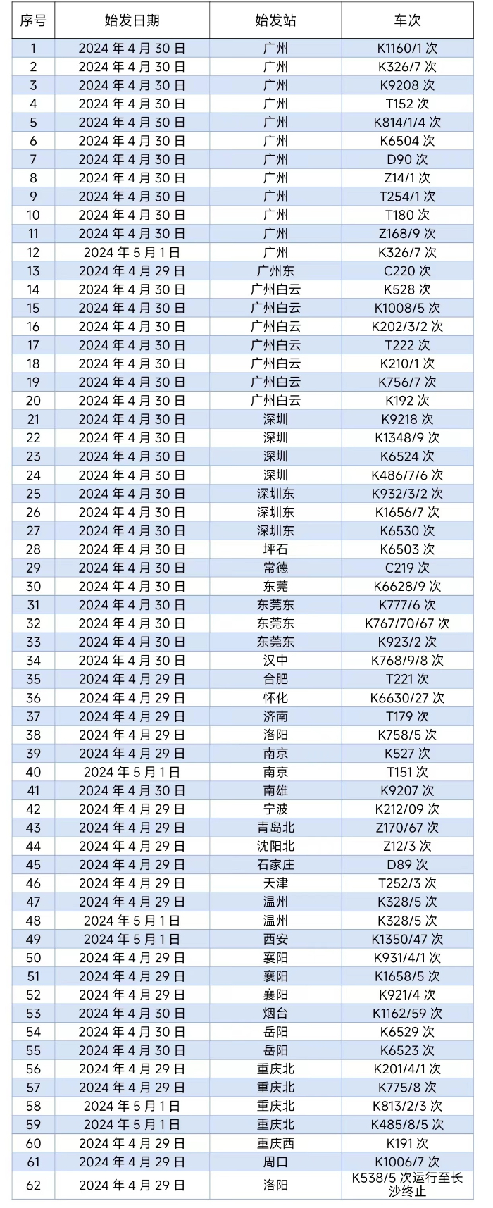 根据降雨影响范围,广铁集团计划于4月29日至5月1日期间停运京广铁路普速列车62列,京广、京九普铁和京广高铁的部分列车将出现不同程度晚点。