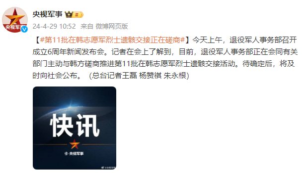 来源标题:第11批在韩志愿军烈士遗骸交接正在磋商