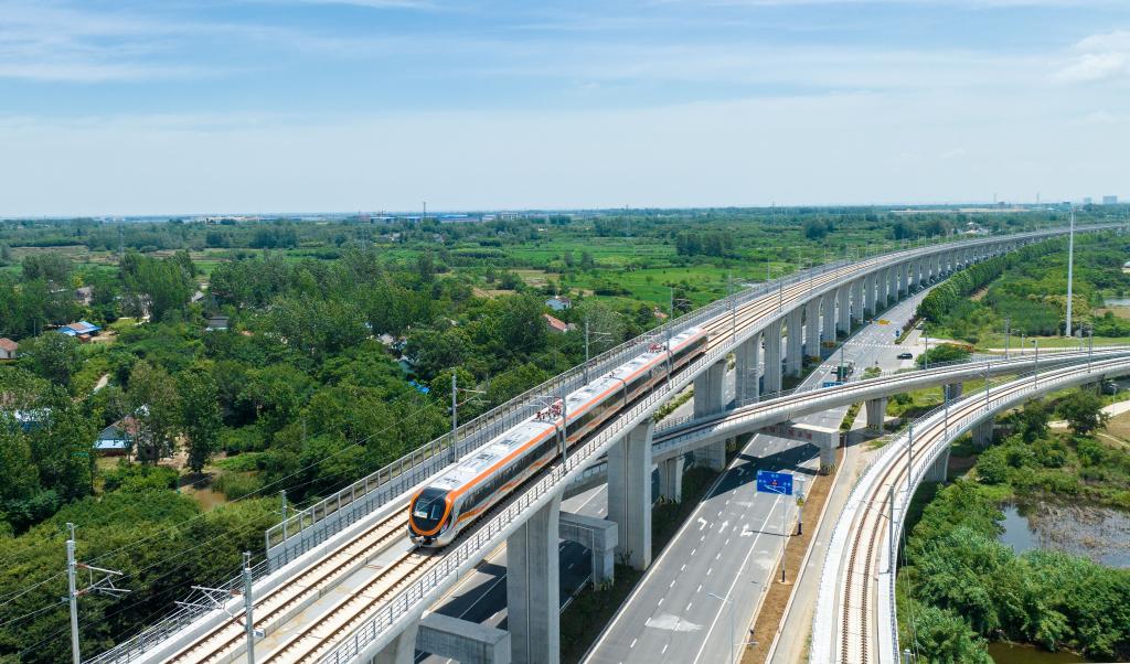 这是在滁州市拍摄的滁宁城际铁路列车(2023年6月28日摄,无人机照片)。新华社记者 刘军喜 摄