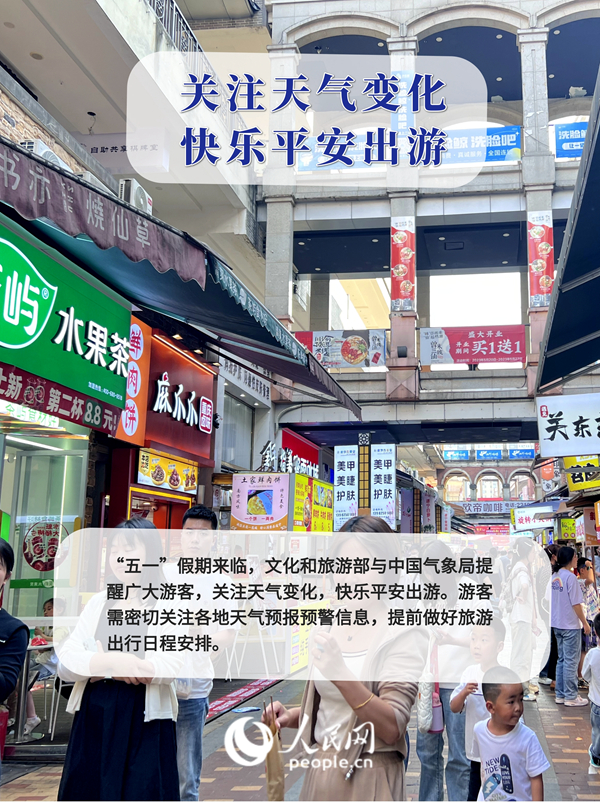 人民网北京4月30日电 (记者王连香)今日,据文化和旅游部消息,"五一"假期即将来临,文化和旅游部与中国气象局提醒广大游客,关注天气变化,快乐平安出游。游客需密切关注各地天气预报预警信息,提前做好旅游出行日程安排。