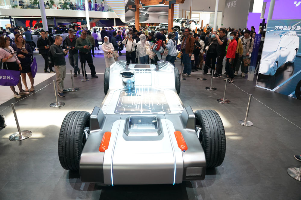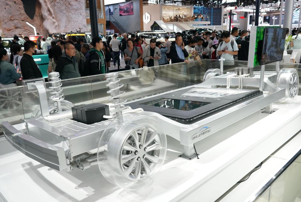 2024年4月30日,在北京车展上,观众在吉利汽车展区参观一款AI数字底盘。新华社记者 张晨霖 摄