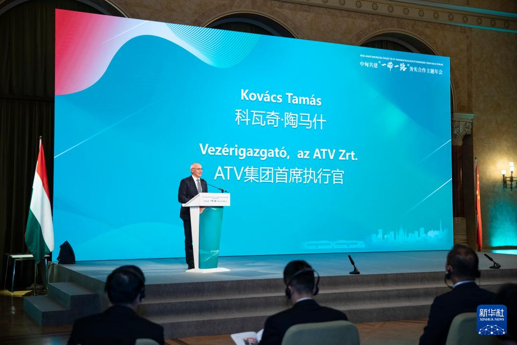 5月2日,在匈牙利布达佩斯,匈牙利ATV集团首席执行官科瓦奇在中匈共建“一带一路”务实合作主题年会上发言。新华社记者 张帆 摄