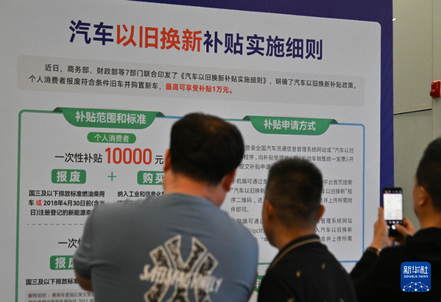 2024年5月1日,观众在西安五一车展现场了解汽车以旧换新补贴实施细则。新华社记者 张博文摄