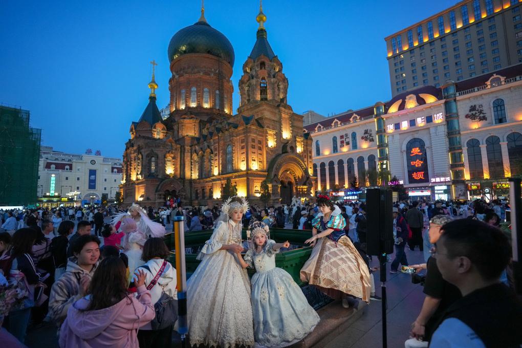 5月1日,游客在哈尔滨建筑艺术广场盛装拍照。新华社记者 王建威 摄