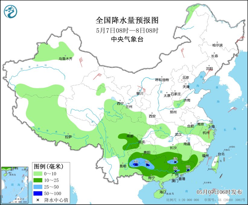 人民网北京5月7日电 (温璐、高清扬)据中央气象台网站消息,昨日,广西中南部、广东中西部、海南岛中部及贵州中北部、云南东南部等地部分地区出现大到暴雨,广西玉林,广东肇庆、佛山、清远,海南白沙,贵州黔南州、毕节等局地大暴雨。预计未来三天,南方降雨呈现西强东弱的趋势,江南、华南等地降雨有所减弱,转为阴雨天气,西南地区降雨增多,四川盆地南部、云南中部和东部、贵州西部和南部等地有中到大雨,局地暴雨。