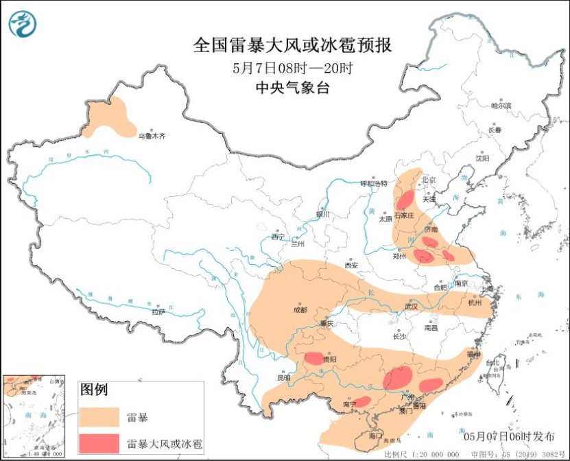 另外,今天白天,河北中部、山东西南部、河南东部、安徽北部、江苏北部、贵州西南部、广西中南部、广东中北部等地的局地将有雷暴大风或冰雹天气,提醒当地公众要注意防御大风或冰雹天气。