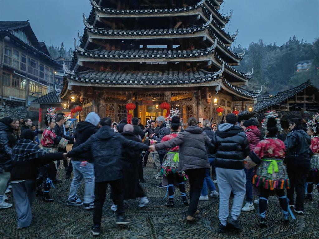 他们饱览村寨建筑风光、体验拦门酒等民俗风情,之后步入寨中的鼓楼内,围坐篝火,与村民展开你来我往的歌唱交流。最后,在鼓楼前的空地上与村民牵手同跳多耶舞,将欢乐的气氛推向高峰。